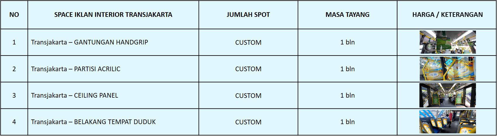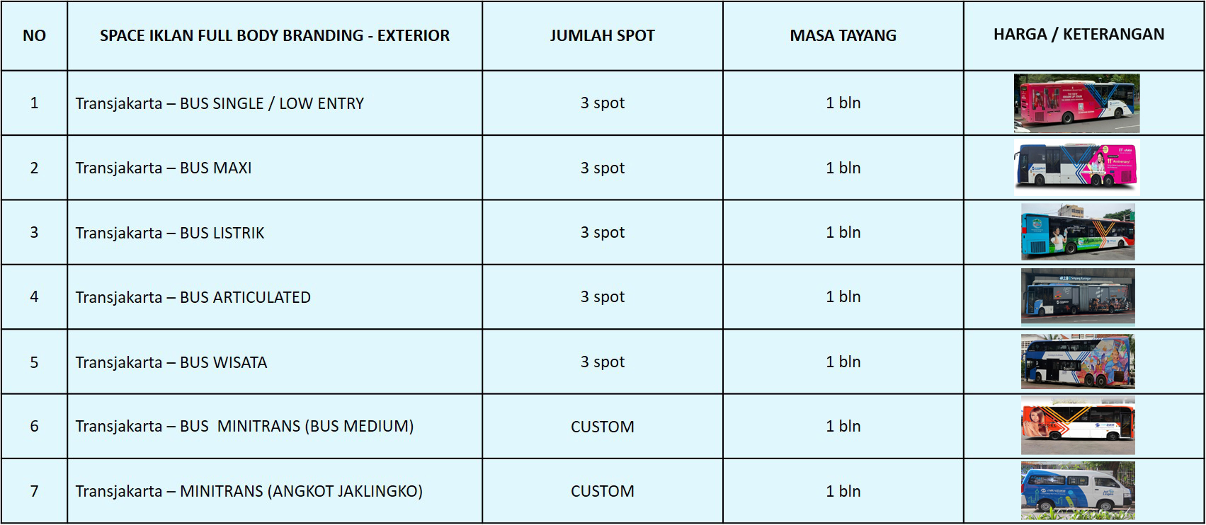 Produksi Sticker one way vision & Visual sticker frontlite Pajak Reklame Perijinan Pemprov DKI Jakarta Pemeliharaan & Perawatan Iklan Kompensasi parkir selama Iklan terpasang Pembongkaran Sticker saat Iklan berakhir Jasa Pelaksanaan | PPn & PPh Design Grafic & Ganti Design |